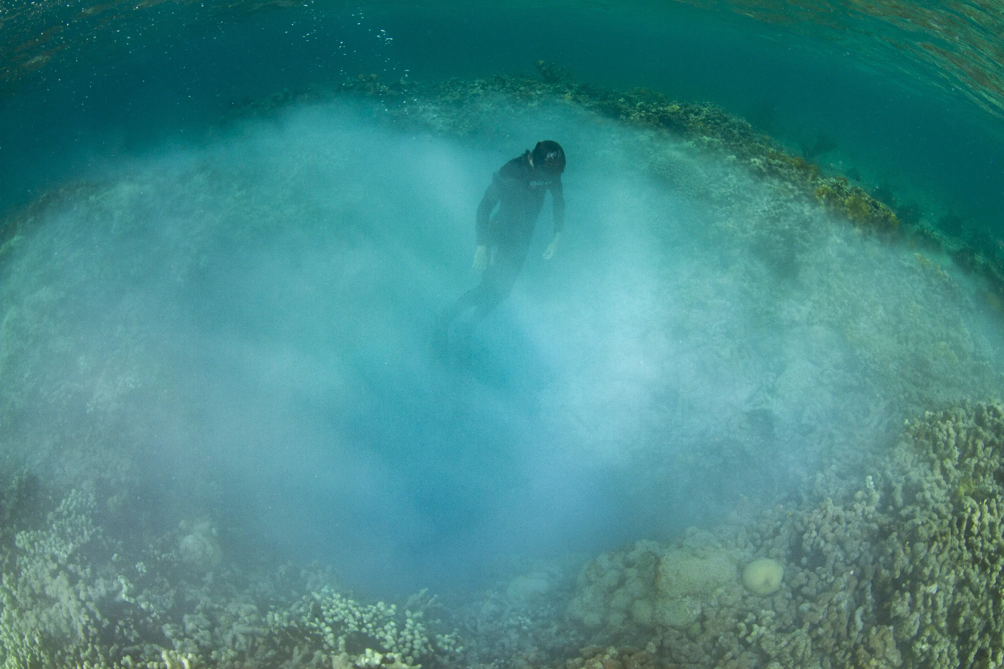 The small blue hole had a milky haze overtop, which enticed many of us to try and dive into it to find clearer waters below! Sure, it wasn’t for everyone, but almost all were tempted to try. Upon our attempts, we discovered the water was much cooler just a few feet into the blue hole, but we laughed as no one would venture deeper! The surrounding reef, however, was vibrant and we explored the vicinity, discovering a smaller blue hole which was more like a narrow crevice in the sea bed.